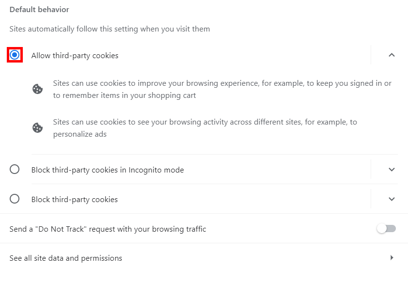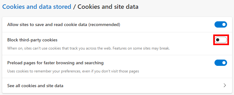 1.6. On the Cookies and Site Data page, select Allow third-party cookies (Fig. 5).