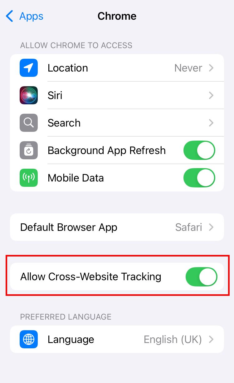2.1. Open your device's Settings, locate and select Chrome from the left-hand navigation, and place the toggle for the option Allow Cross-Website Tracking in the on position (Fig. 6). The following is on an iOS device using version 18.1.1.