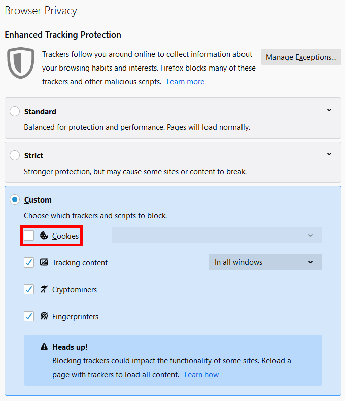 3.3. On the Browser Privacy page, select the Custom drop-down menu. Make sure that the checkbox next to Cookies is unchecked (Fig. 11).