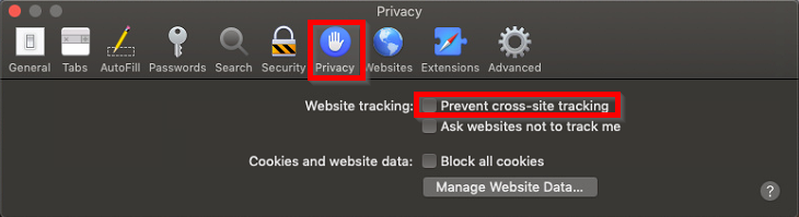 6.2. Navigate to the Privacy Tab and make sure "Prevent cross-site tracking" is deselected (Fig. 21).