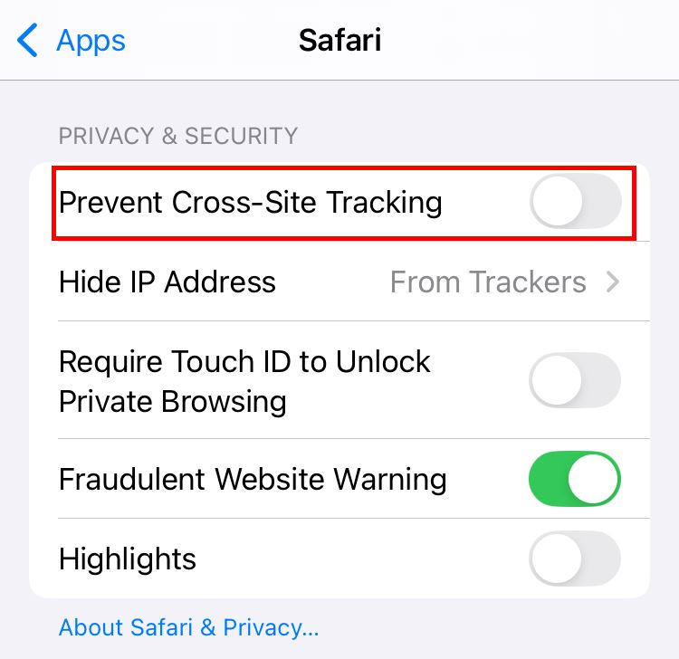 7.1. On your device's Settings, select Safari from the left-hand navigation. Scroll down to Privacy & Security, and make sure that the toggle for Prevent Cross-Site Tracking is toggled in the Off position (Fig. 22). The following is on an iOS device using version 18.1.1.